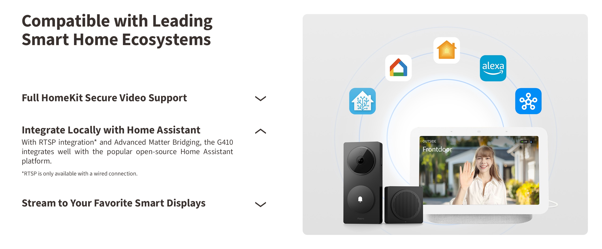Широка інтеграція: Apple Home, Google Home, Alexa, SmartThings, Home Assistant (RTSP по дроту).